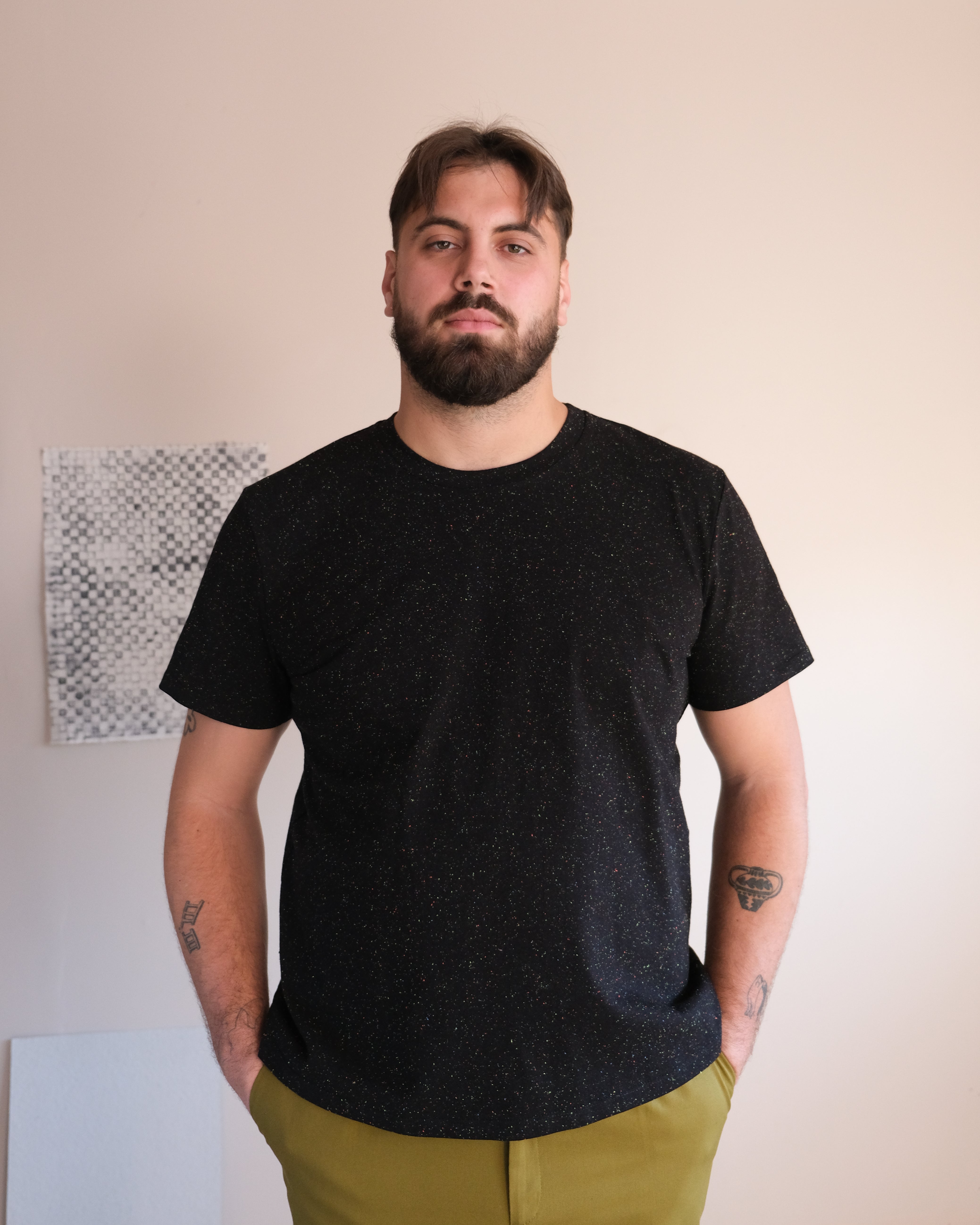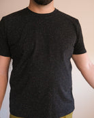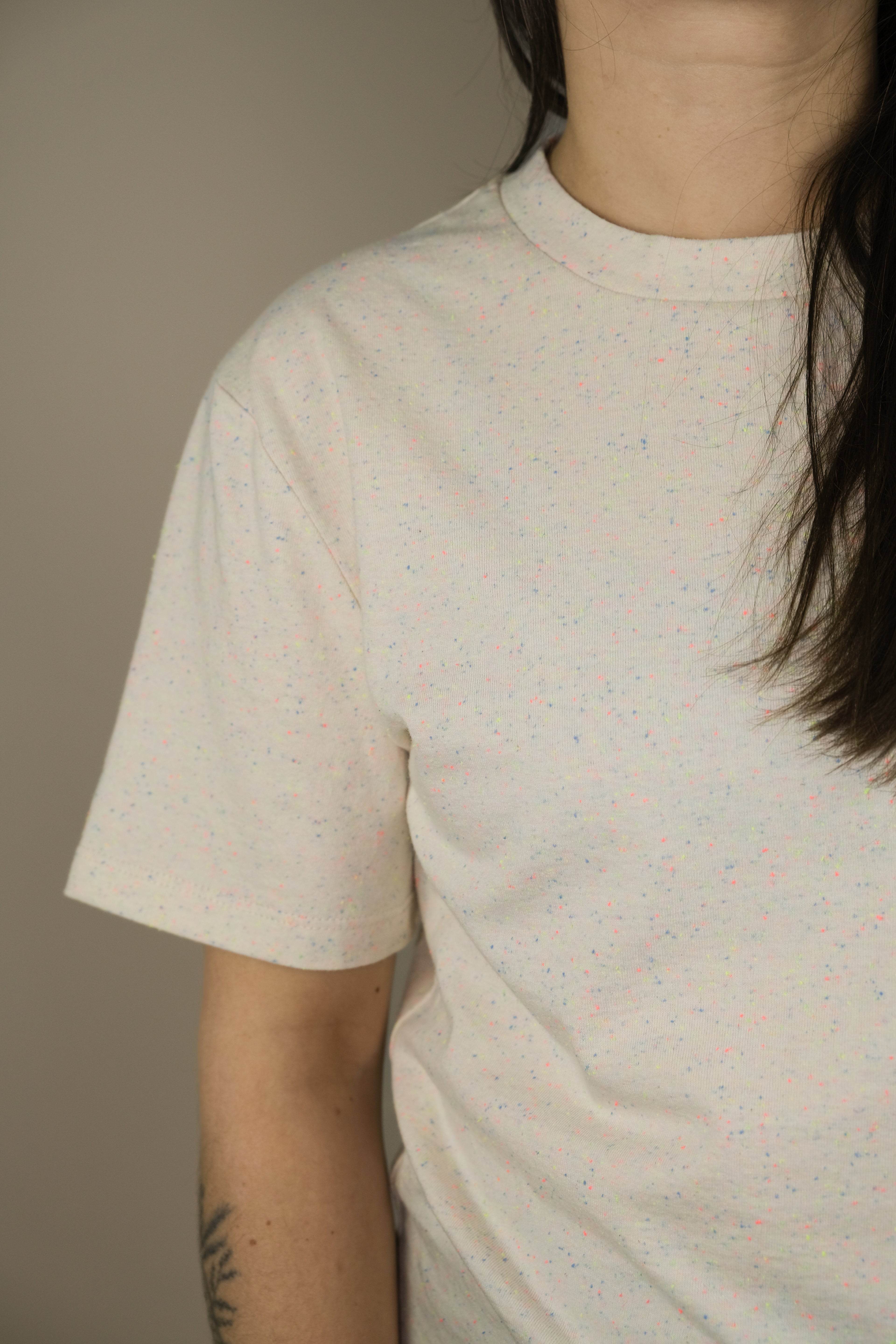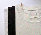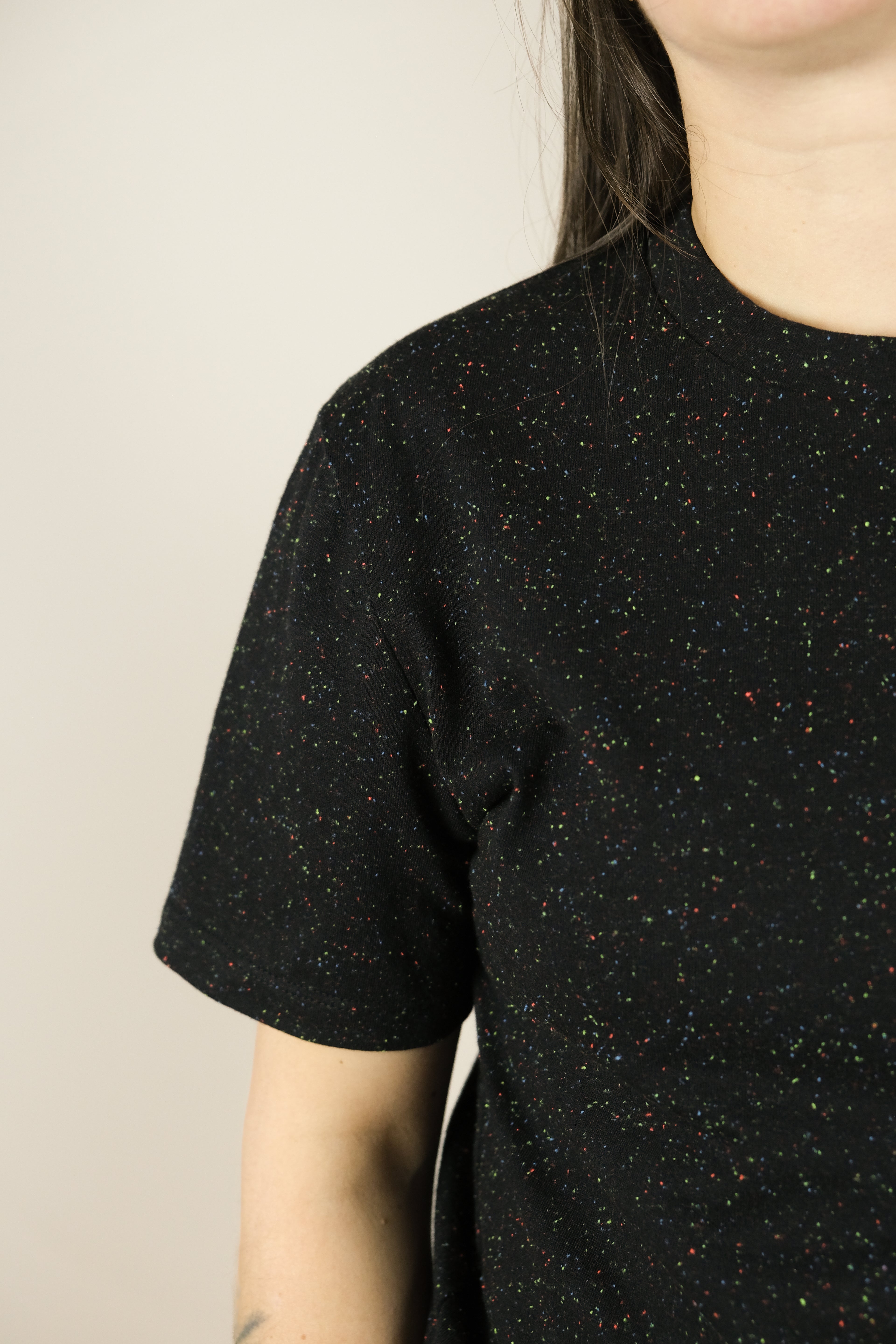 Les confettis sont de retour ! Notre tricot jersey est maintenant tricoté au Canada. T-shirt unisexe en jersey structuré, coupe droite et classique. Biais grège à l'encolure. Offert dans deux couleurs : crème et noir.