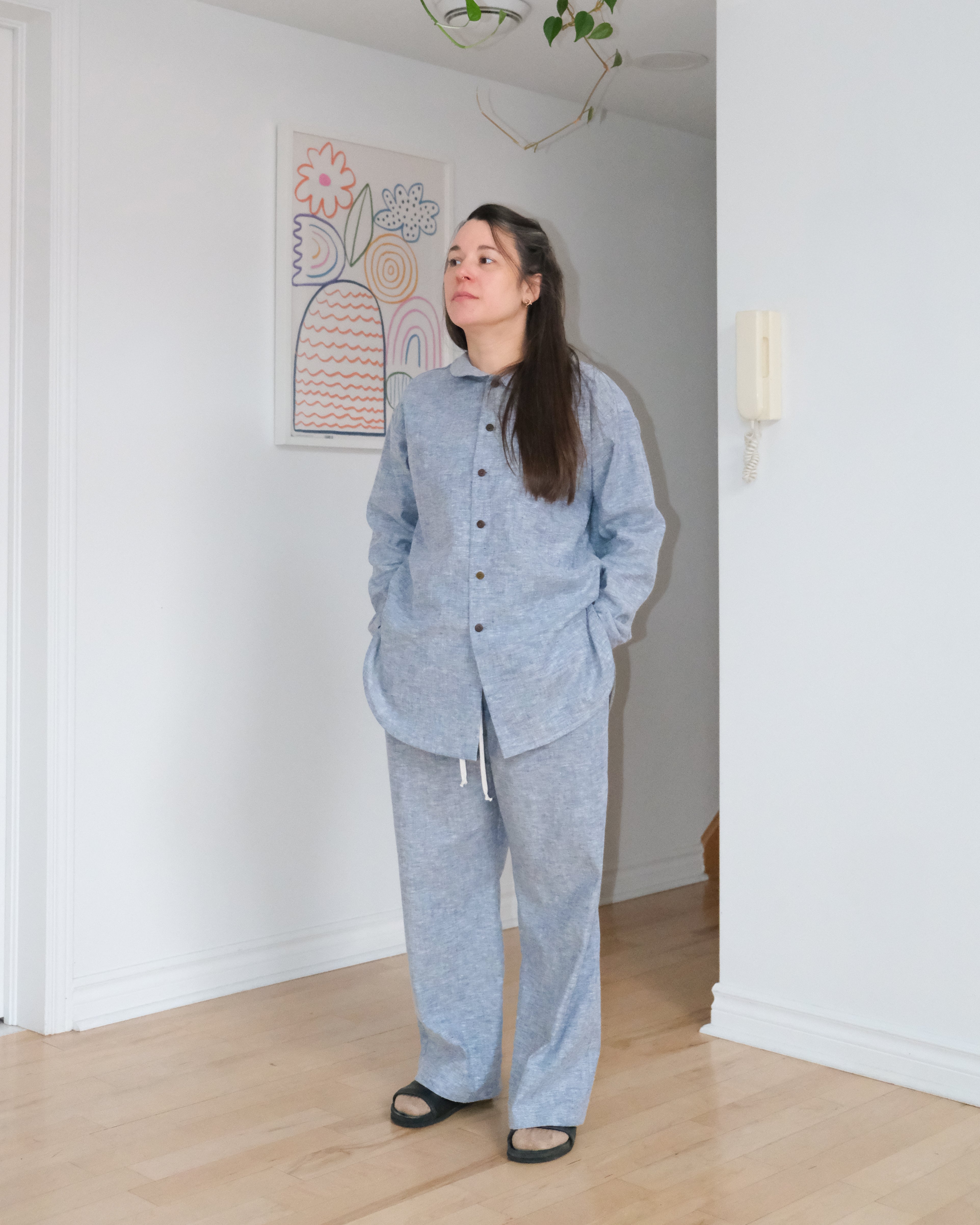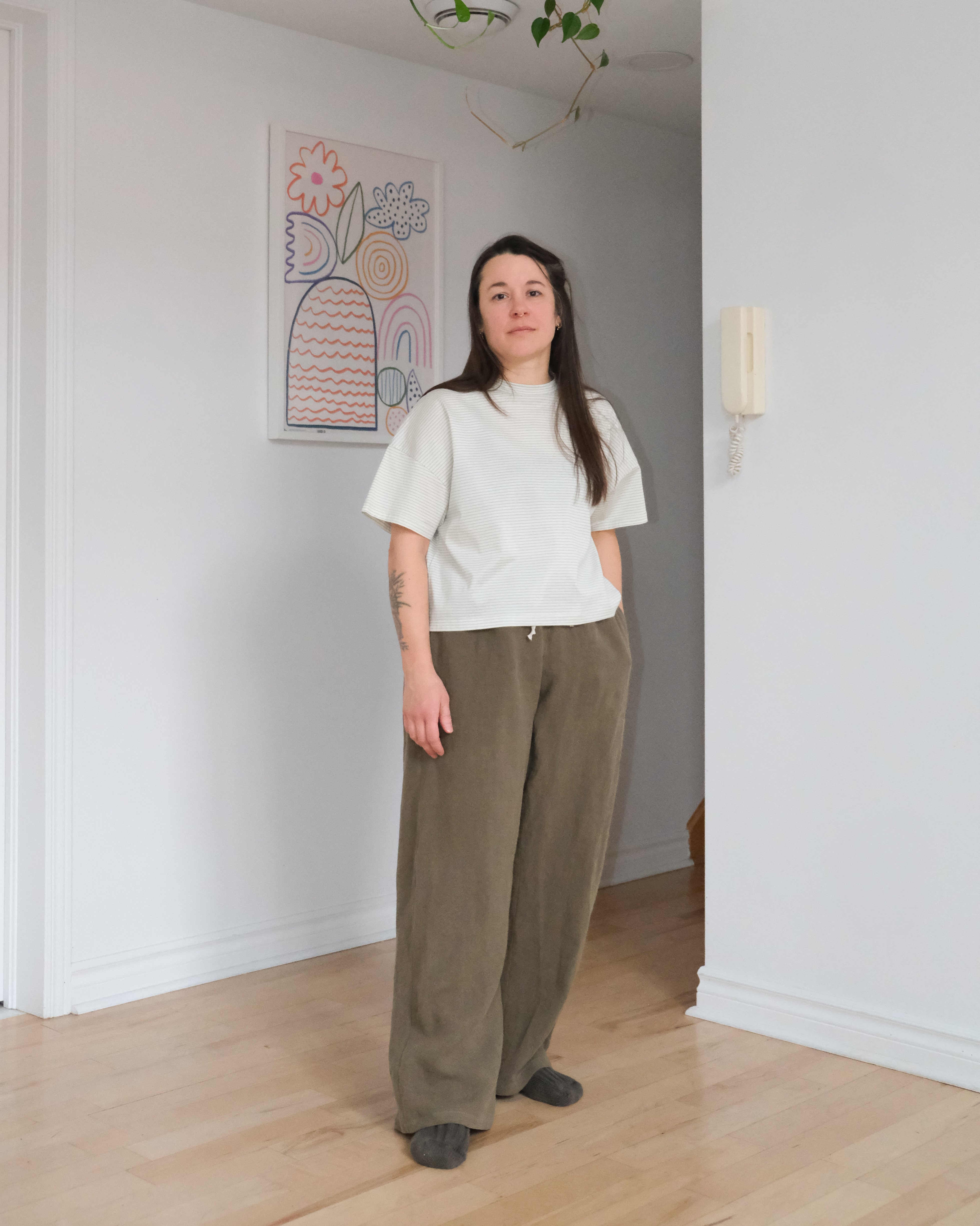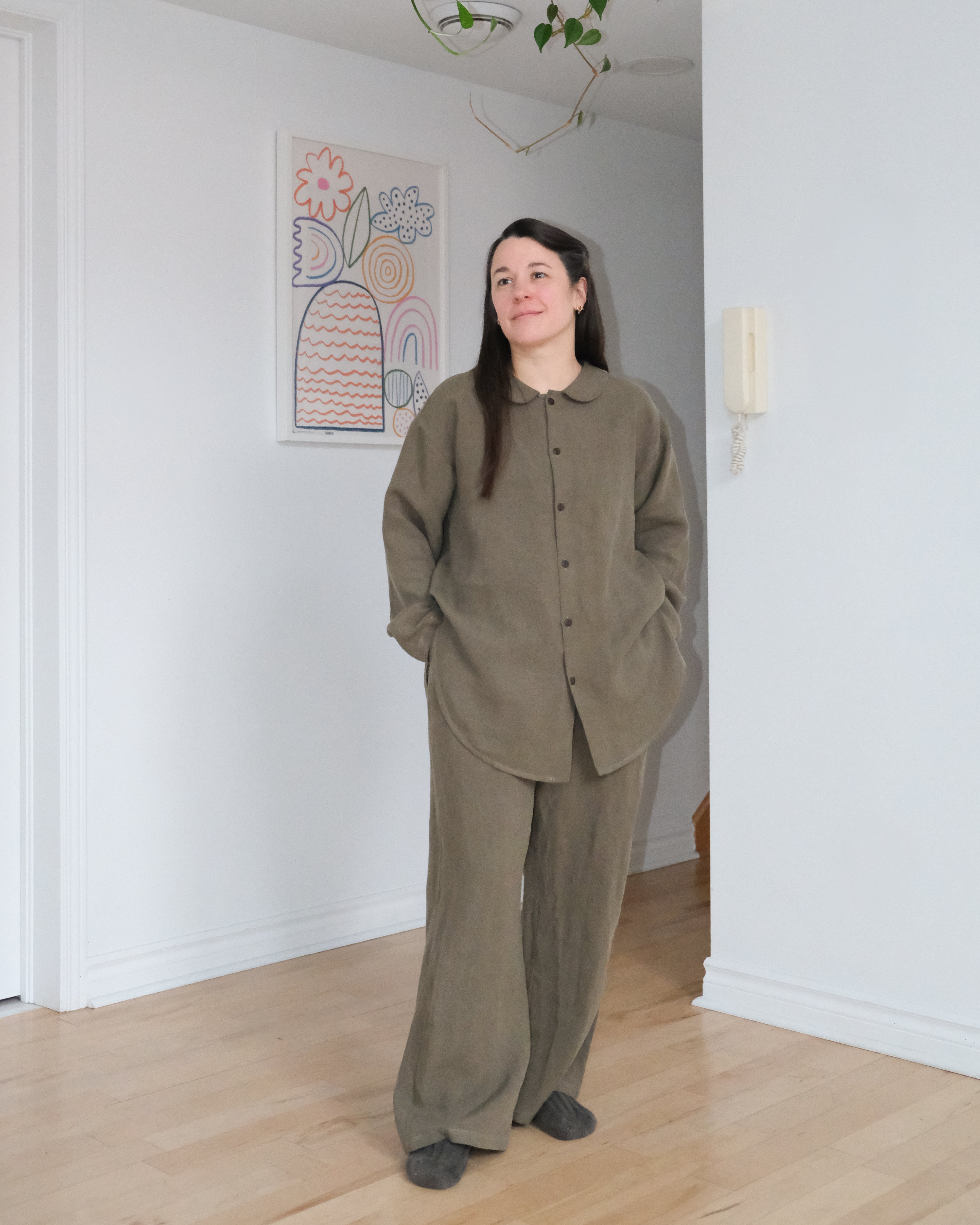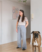 Le pantalon ample d'intérieur est inspiré par notre pantalon No2574u. Taille élastique confortable avec surpiqures et poches aux latérales. Confectionné dans un lin pré-assoupli olive ou un chambray mélange chanvre et coton tout aussi doux.