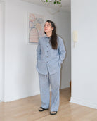 Chambray bleu 53% chanvre, 47% coton. Toile olive 100% lin pré-assoupli. Laver à la machine à l’eau froide, au cycle délicat. Suspendre pour sécher. Repasser à haute température.