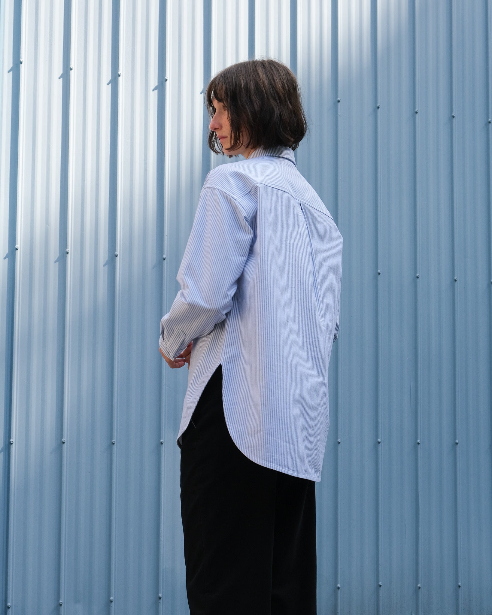 The No2557w shirt has a loose and rounded fit. This version is made with a blue and white striped cotton. Rounded shirt collar, tortoiseshell buttons and front pocket. Rounded hem with side slits.