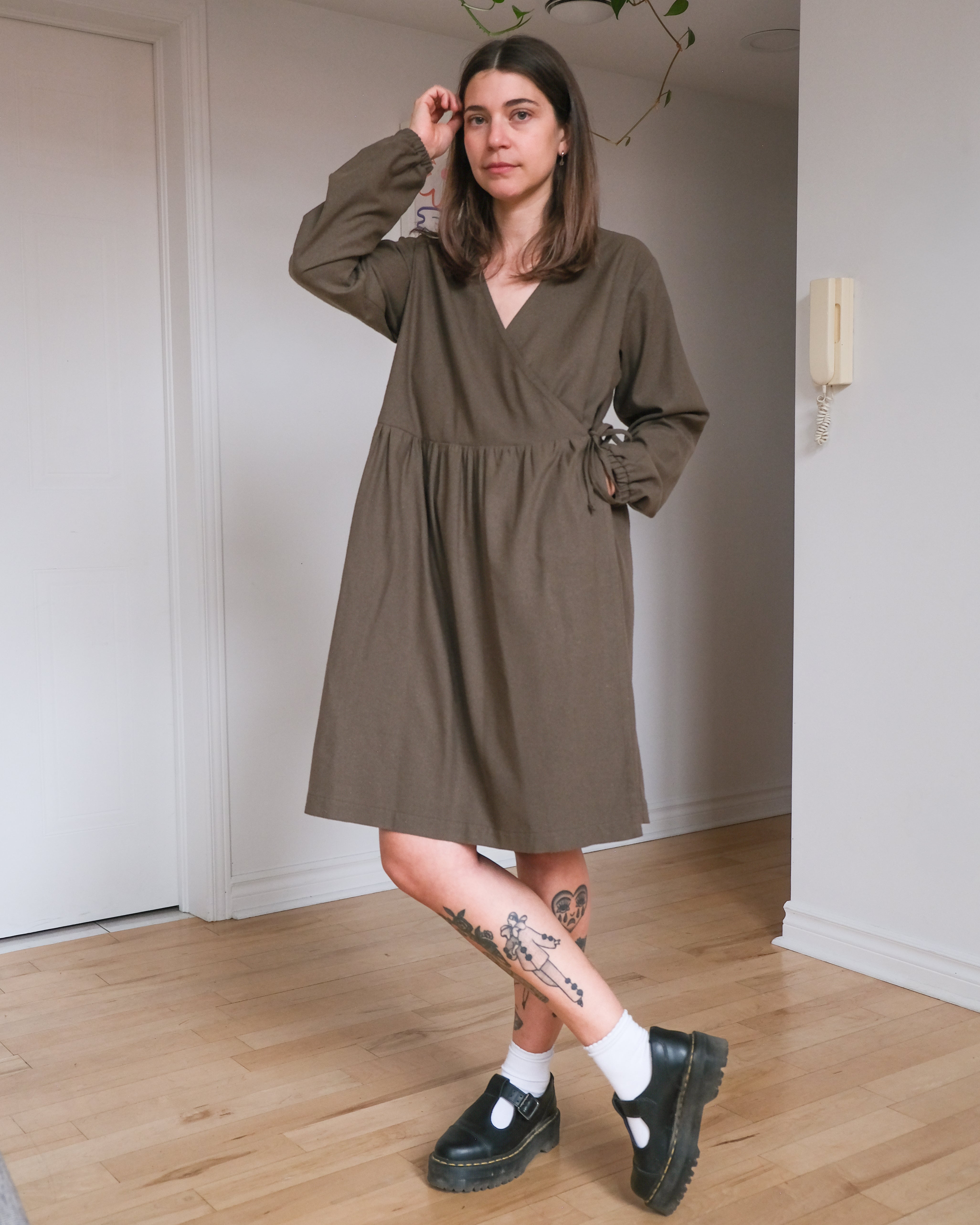 Dress No2577w has a loose fit and a crossover front. Gathering at the waist adds volume to the skirt. It features elasticated cuffs, a crossover V-neck, diagonal ties at the sides (inside and out), and slanted front pockets. The hem is straight and just above the knee.