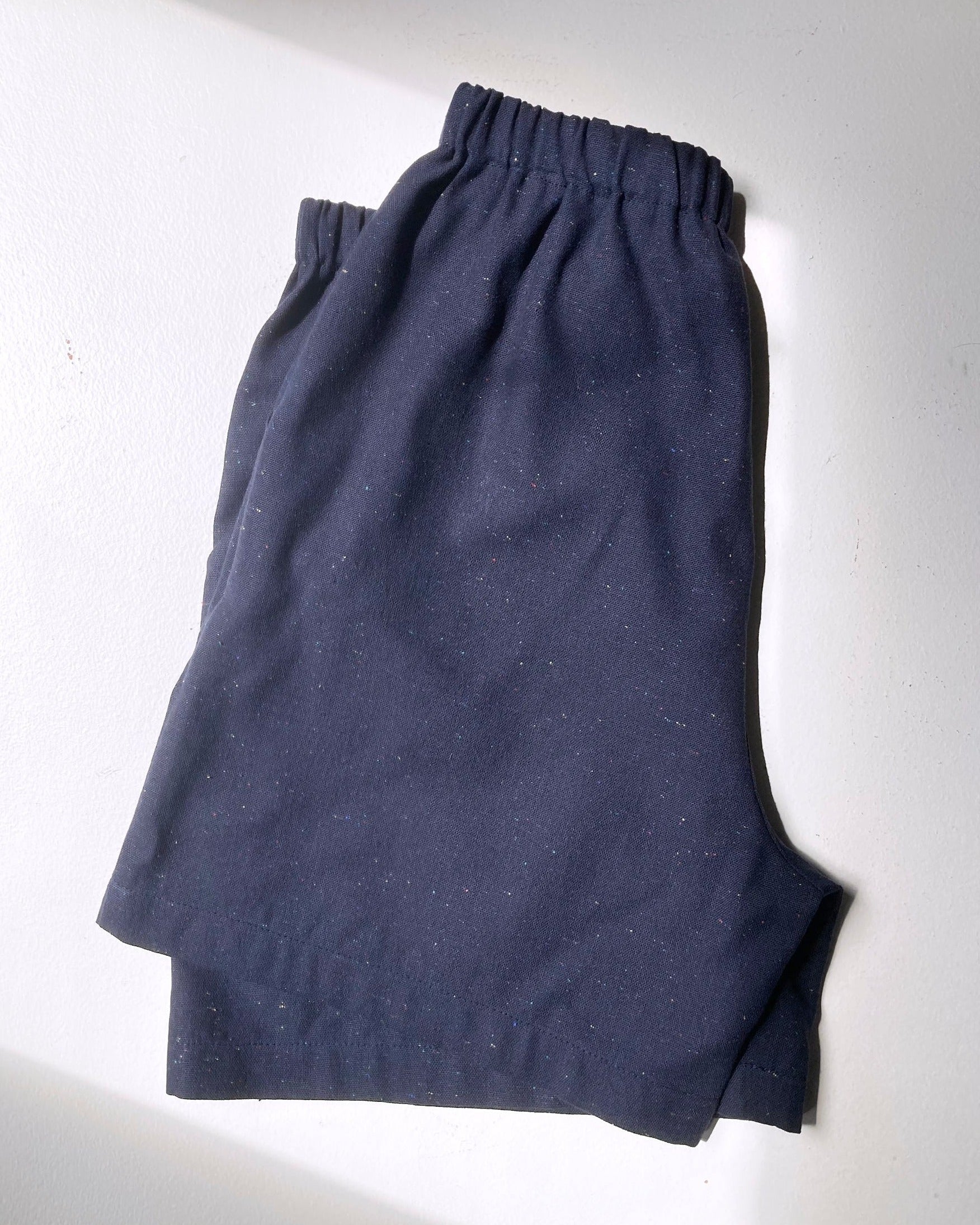 A casual, gender-neutral short that can accommodate a variety of styles and bodies. The fit is less formal and less fitted than our classic linen shorts no2235w. This version is made with a navy confetti cotton and linen mix.
