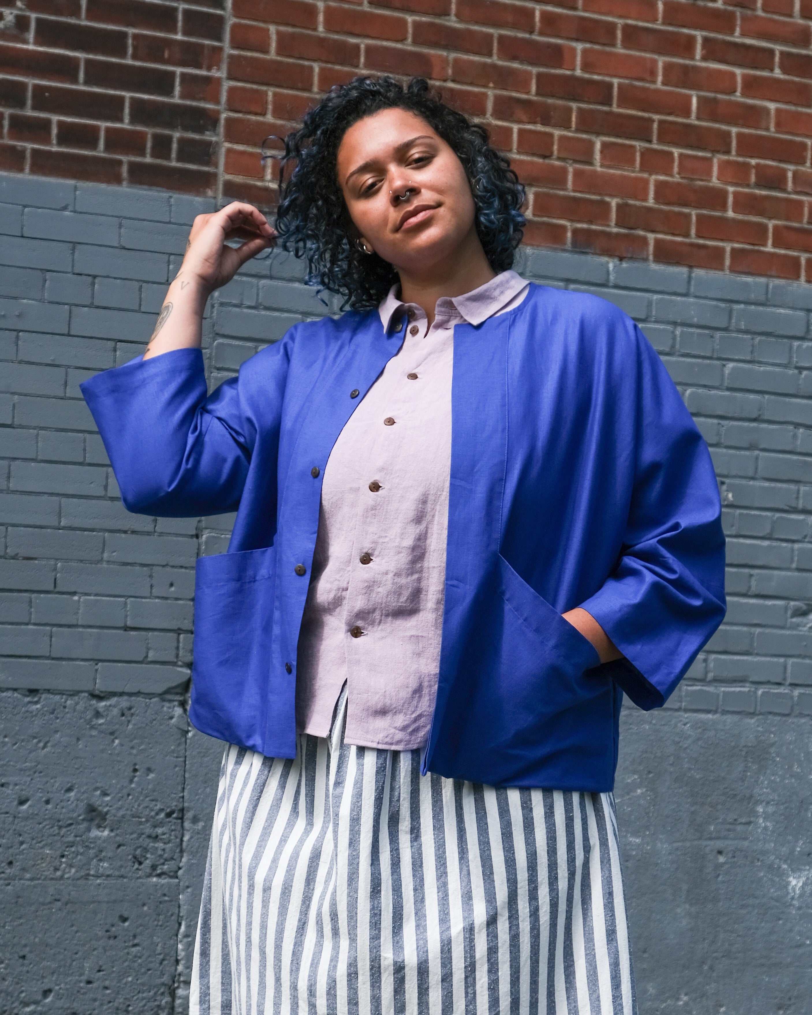 This version is made with a canvas made from linen and cotton in two saturated colours, copper and cobalt. We've also made a second version with a cotton and raw silk blend with blue and white stripes. The silk gives it a light texture.