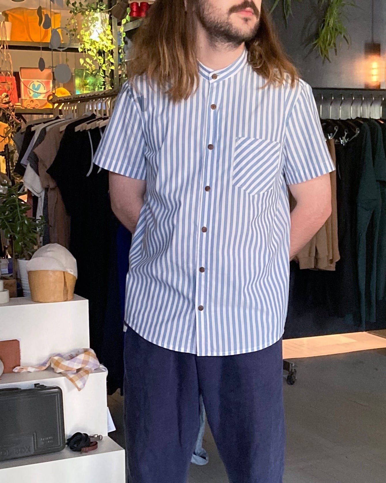 Our short-sleeve shirt No2444m is also available in pale denim or coffee and black linen.