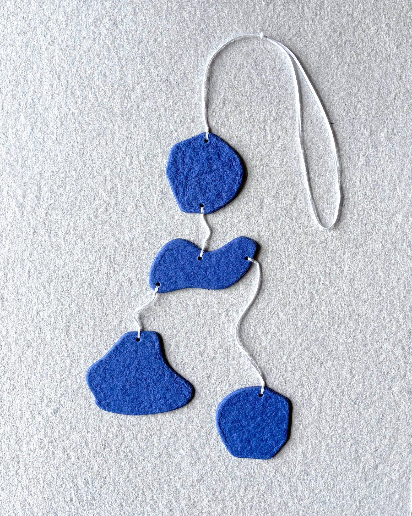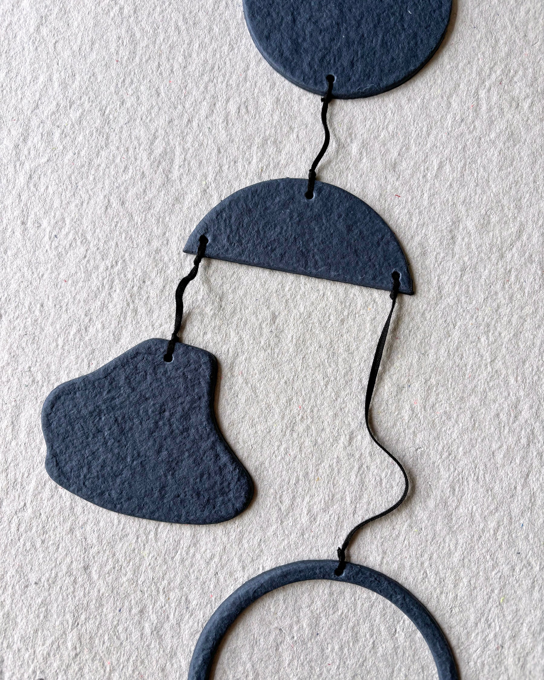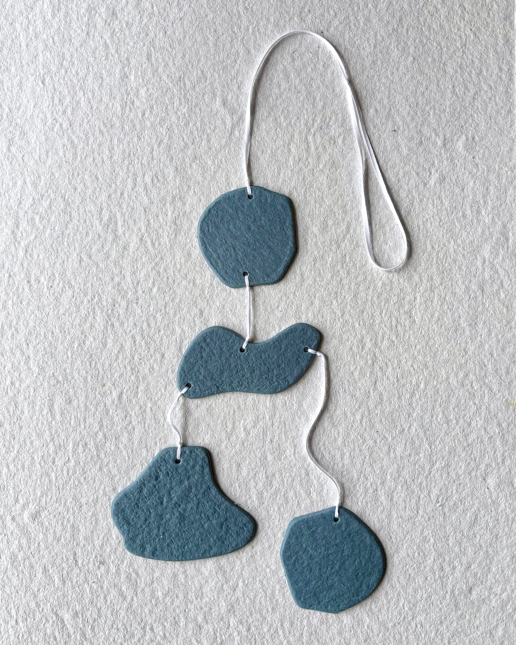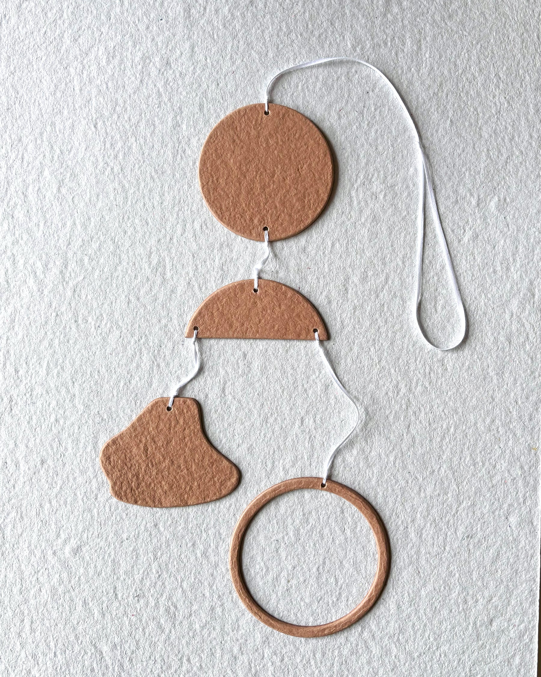 Mobile to hang made as part of our circular economy project. For adults or children, the shapes are playful and sweet and we hope they will make you smile!