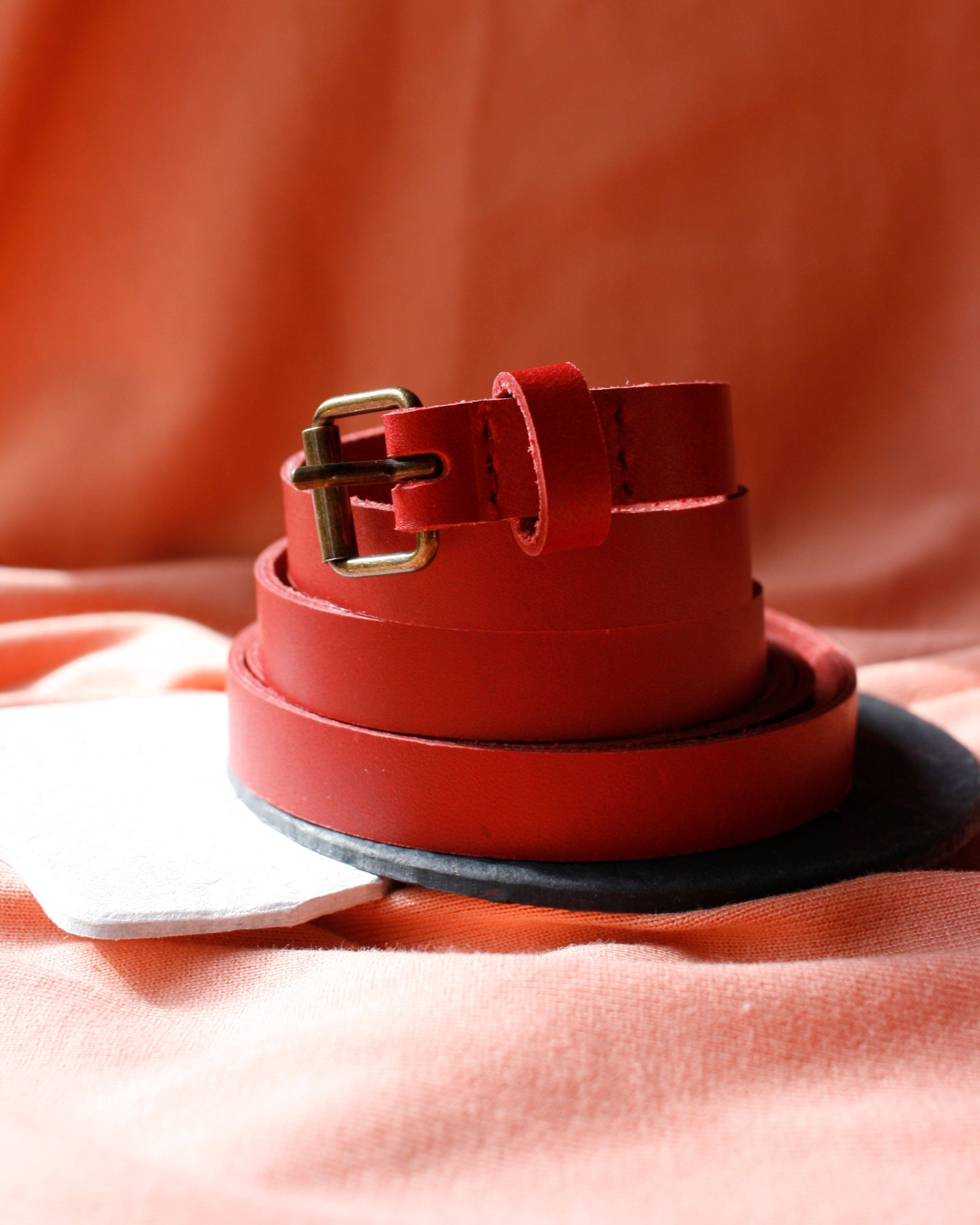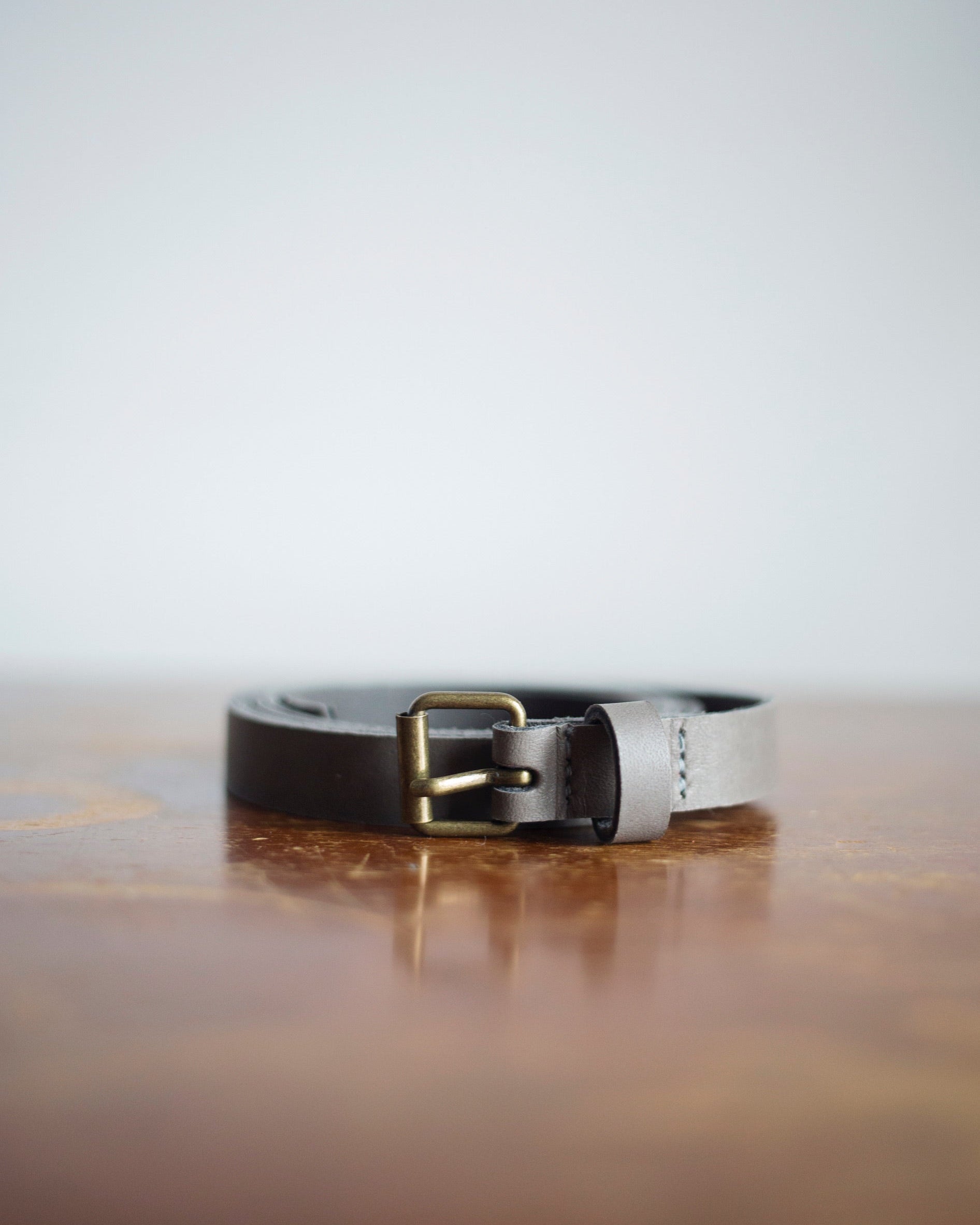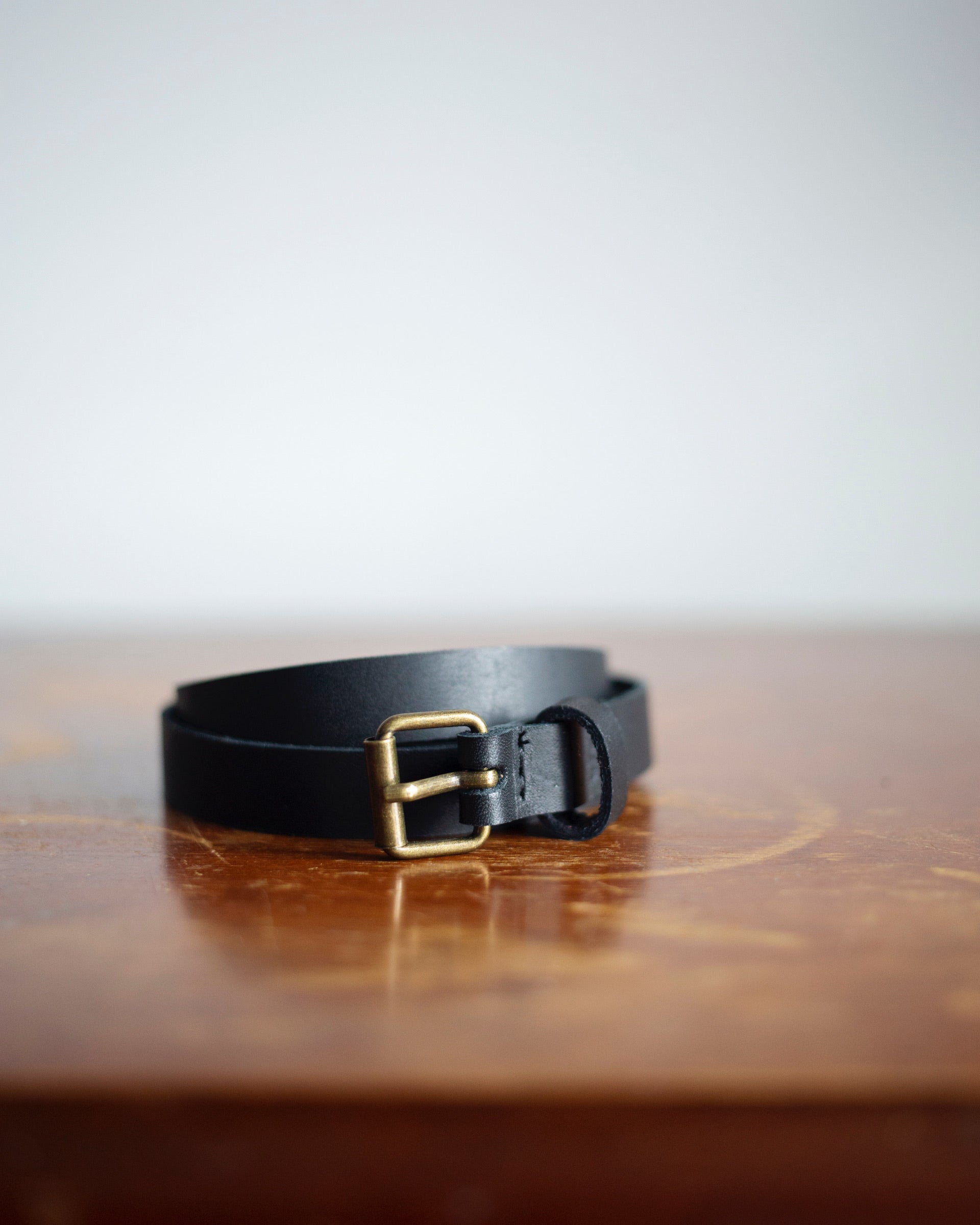 Genuine Canadian leather belt. 13mm wide, with long knotted end. Antique bronze coloured metal buckle.