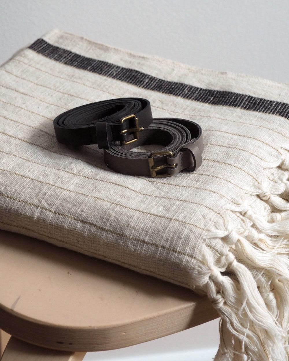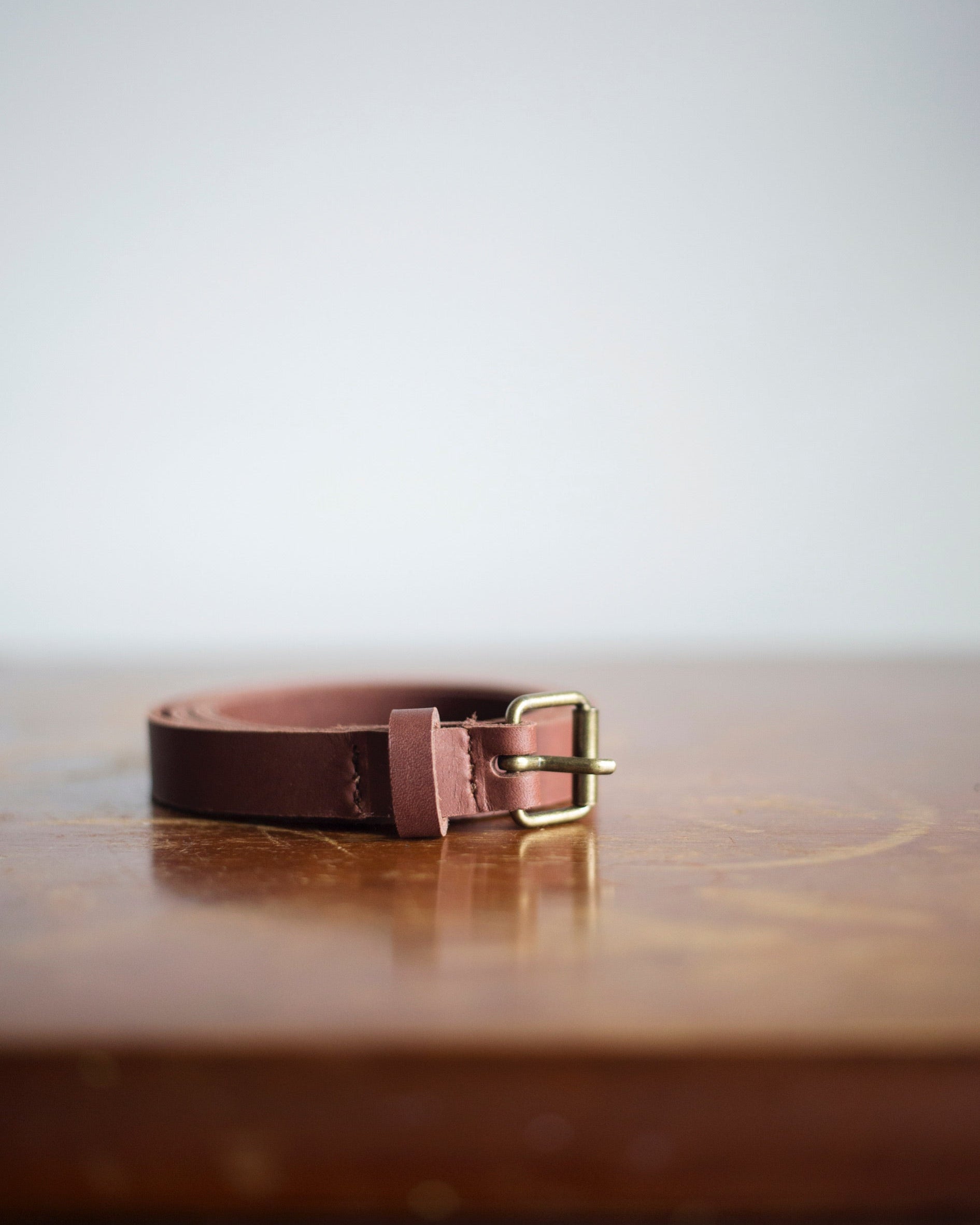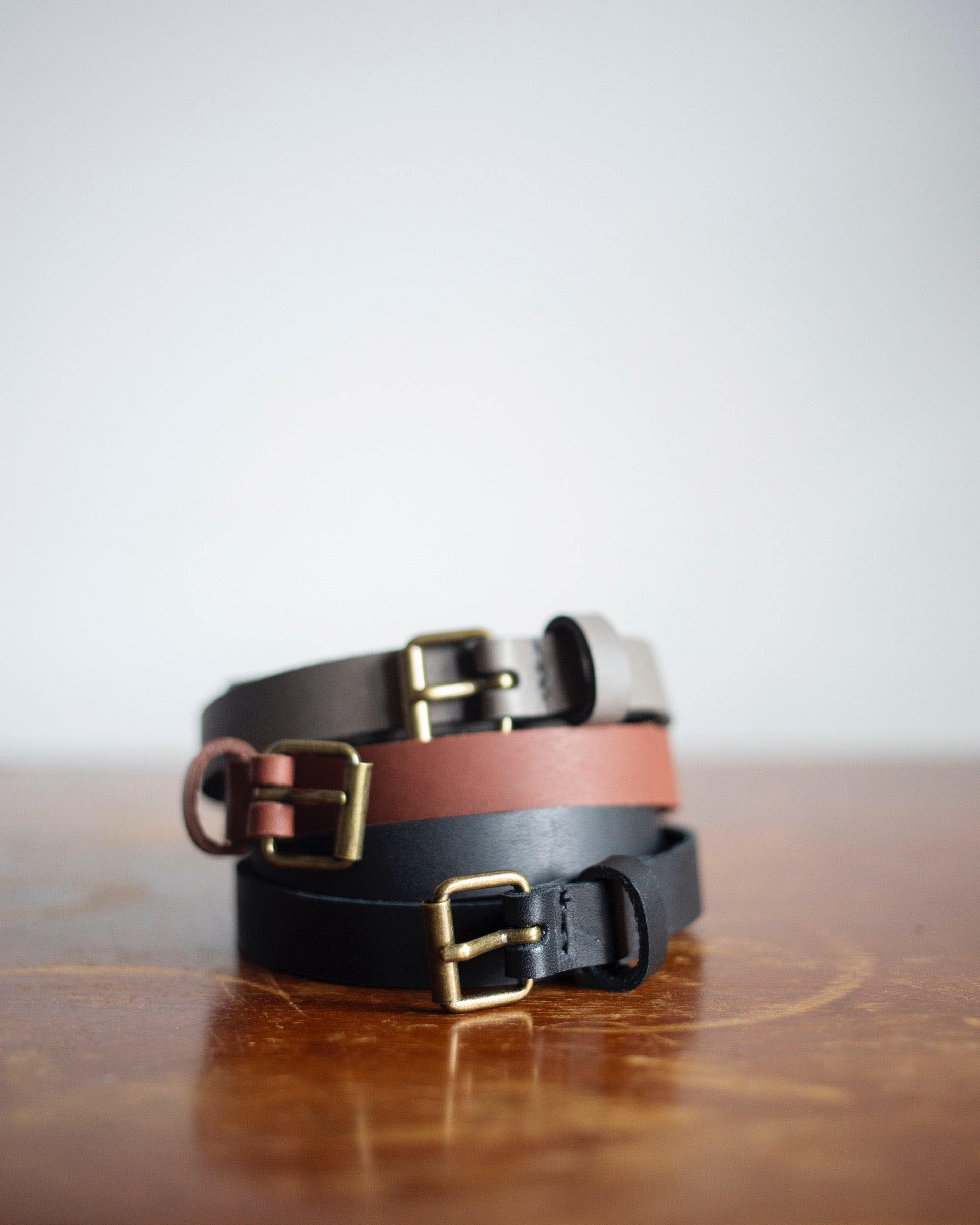Genuine Canadian leather belt. 13mm wide, with long knotted end. Antique bronze coloured metal buckle.