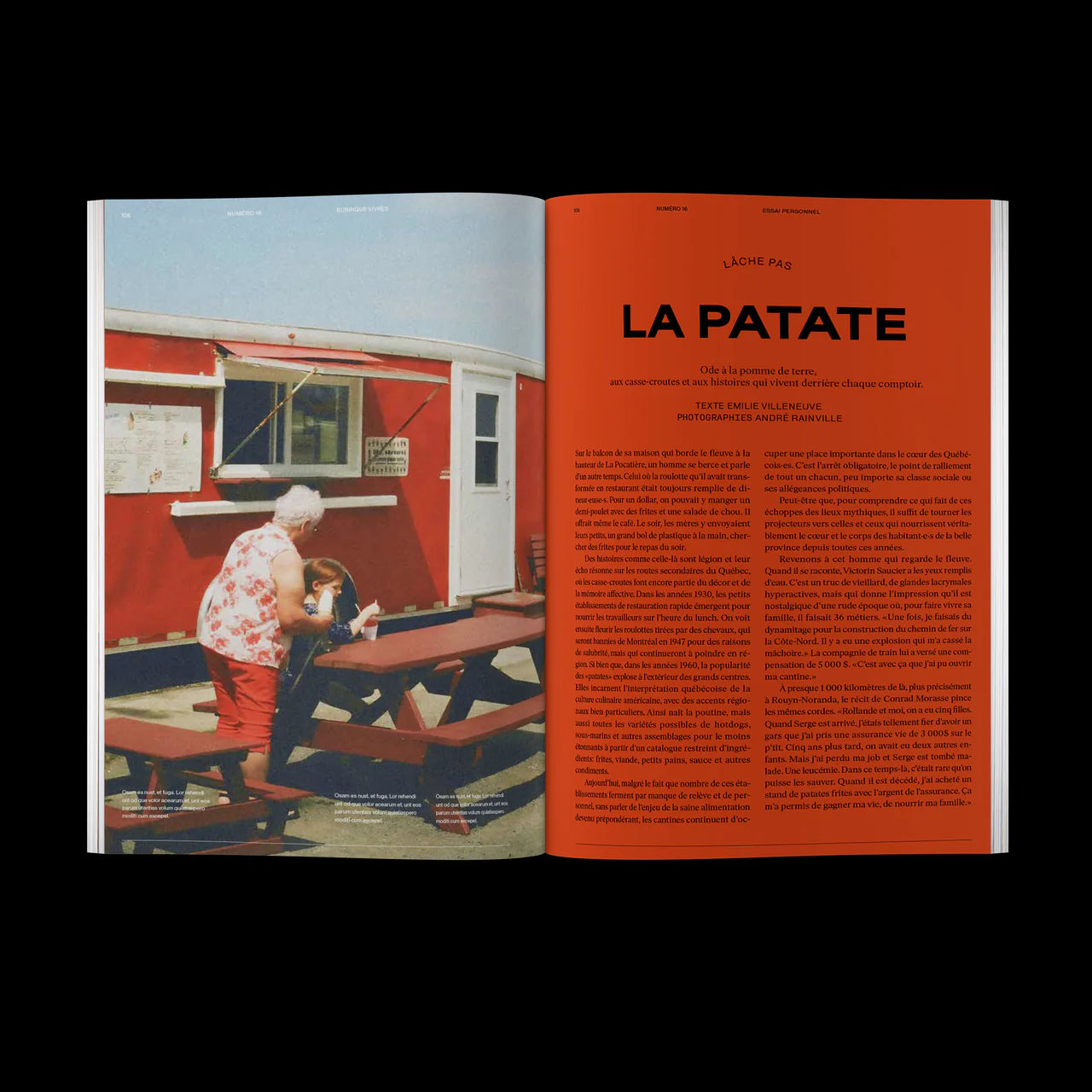 - A cultural essay on snack bars by Emilie Villeneuve;