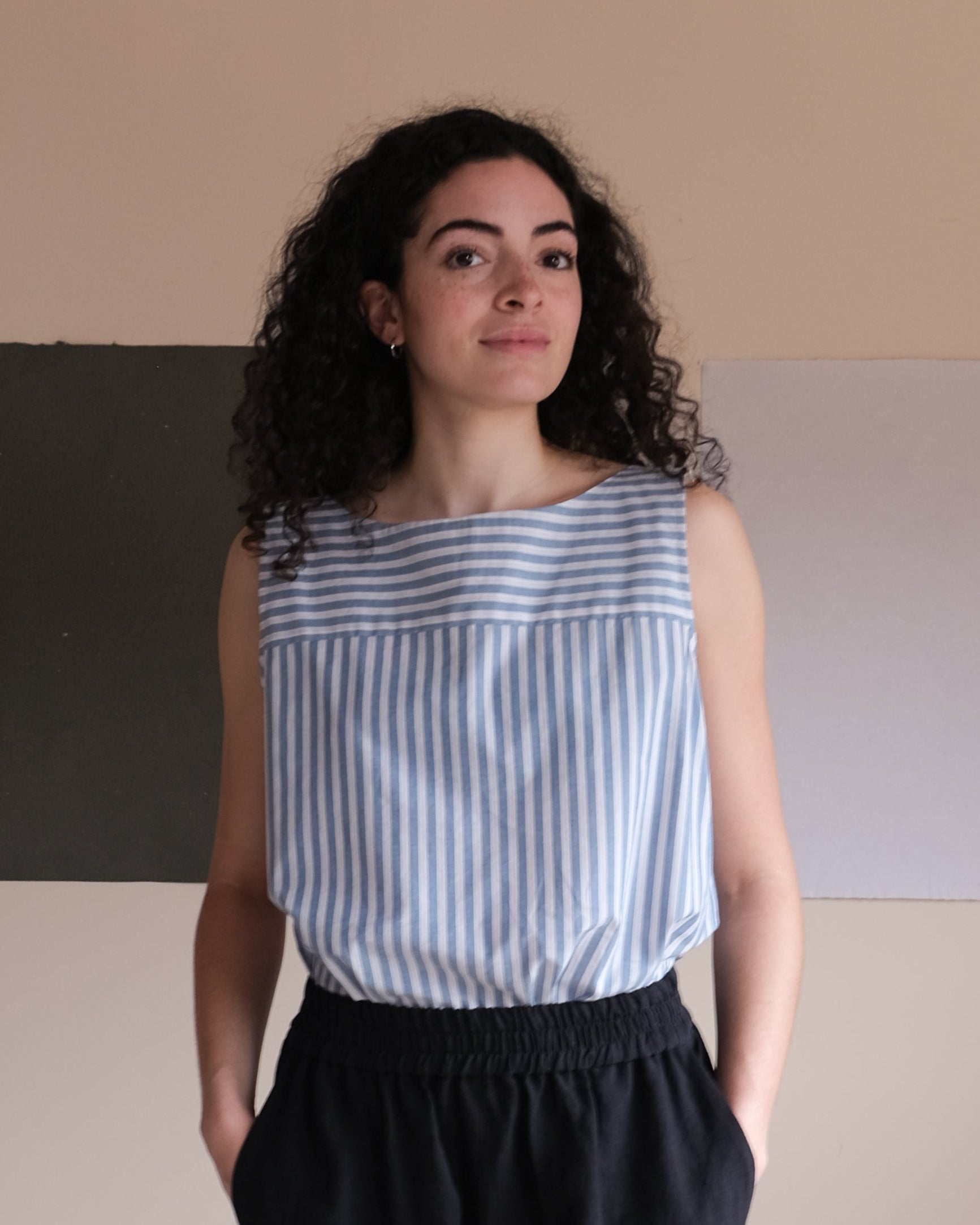 The no2418w camisole may seem simple at first glance, but it's in the details of its confection that you can see its complexity. A classic and lightweight top made from three different materials: a striped cotton poplin, a raw silk and a cotton and linen canvas dotted with colourful confetti.