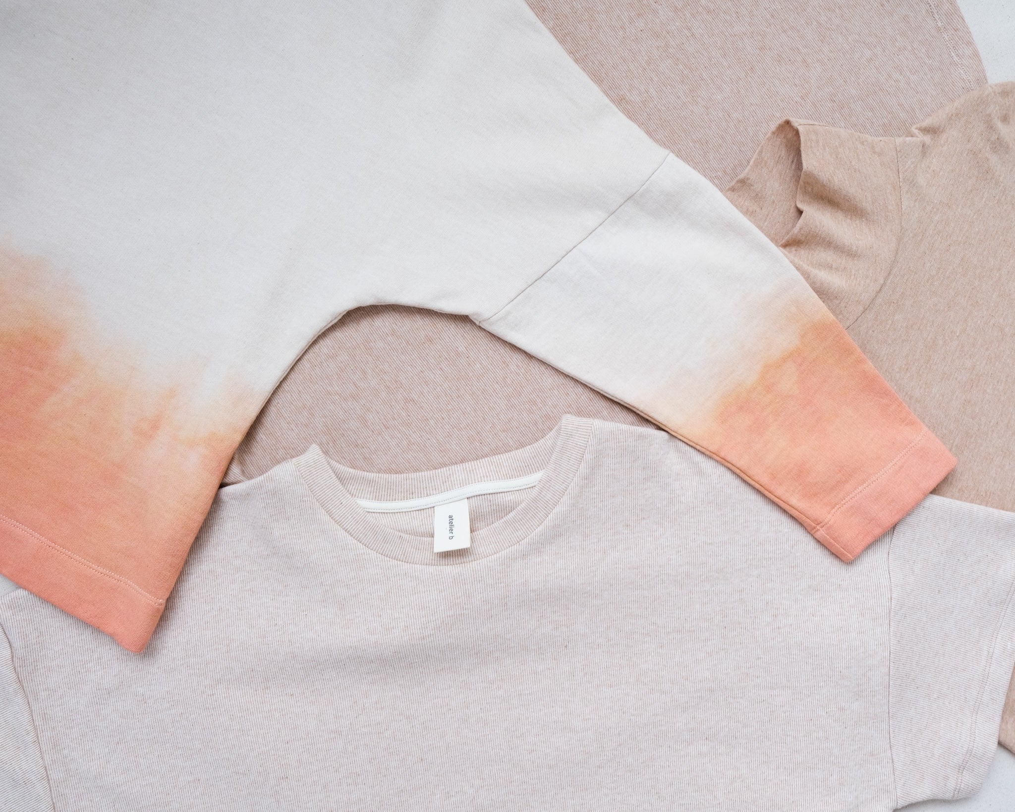 A version of our cottage sweater made in collaboration with Montloup and Marie-les-bains. Made from a French terry knit of organic cotton and Rambouillet wool, this sweater is dyed in a gradient with American madder. As we chose to dye this garment naturally, the color varies between pink and orange. Round neckline, low armhole and loose fit.