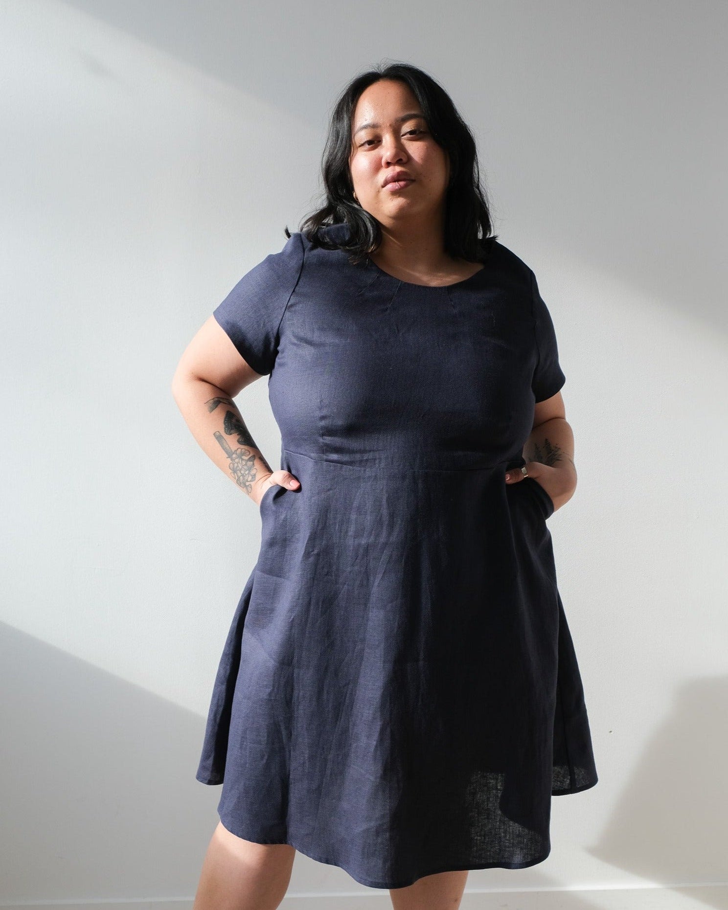 Our classic a-line dress, made from two materials that have become classics here ate the workshop! The striped dungaree fabric is a blend of cotton and linen and the 100% linen fabric is navy blue and coral. These neutral and durable materials will soften with time and washing. Structured cut, the top is fitted with the addition of darts while the bottom falls in volume. Slanted pockets and invisible clasp at the back.