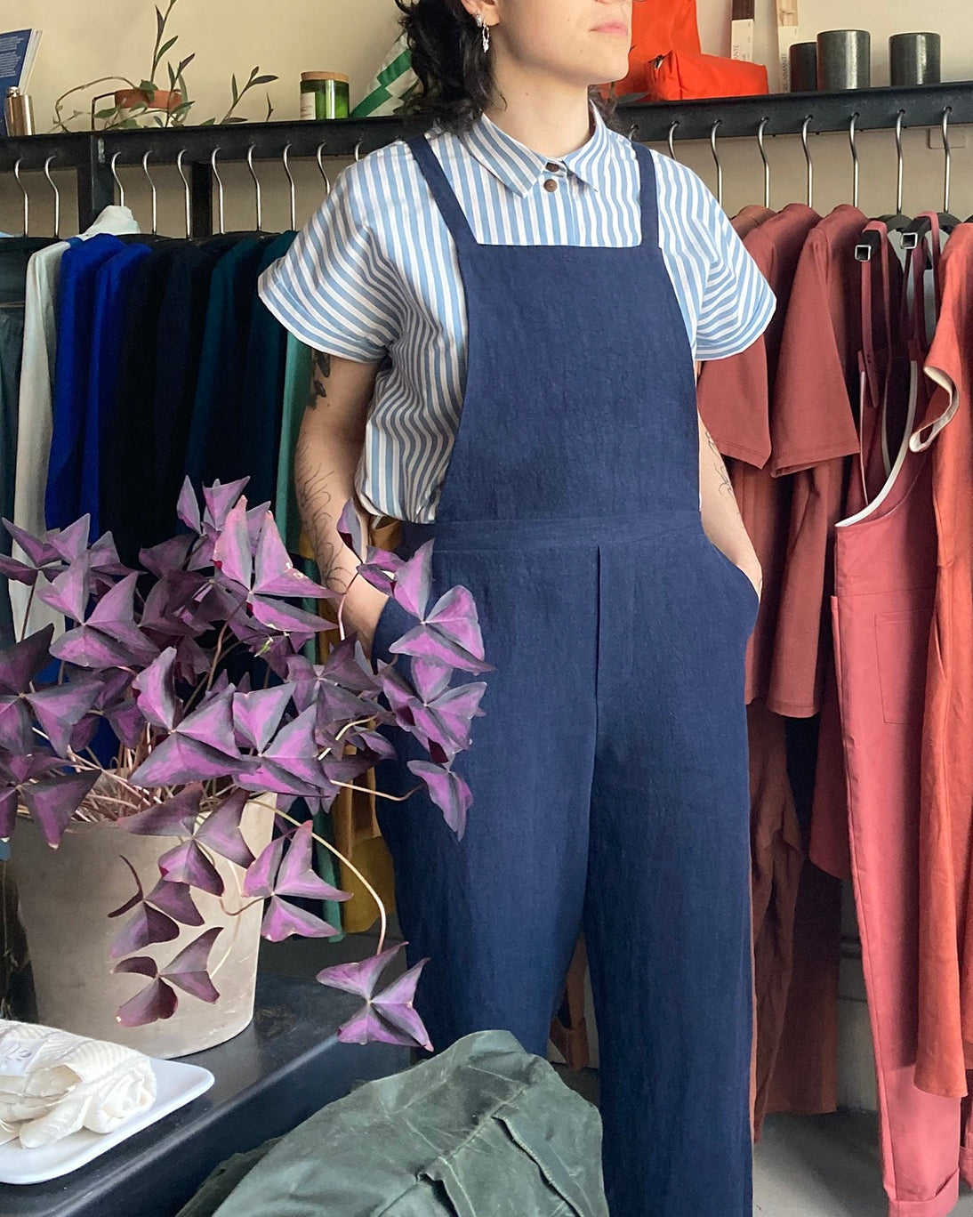 We're going back to our roots with the No2427w overalls. This garment is based on our classic No2237w linen trousers and reflects our love of workwear. This season, we've reworked the fullness of the leg and hips to make it less fitted, more comfortable and easier to put on. Side slanted pockets and back patch pocket. Adjustable straps. An elastic waistband in the back for added comfort.