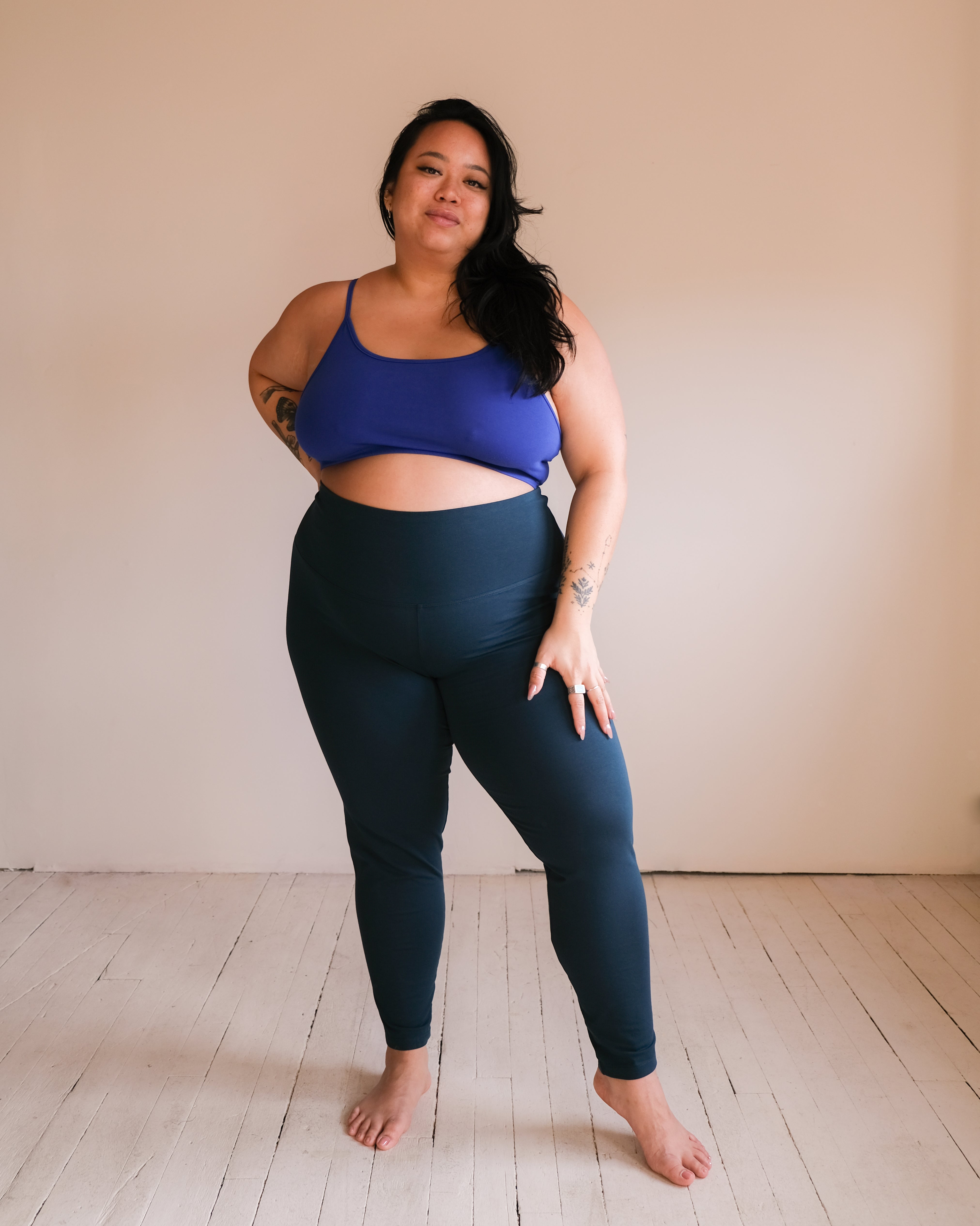 Sheila wears the size 2x in cobalt and lilac. Chelsea wears the size s in black and marled grey. Gabrielle wears the size 4x in sand. Alex wears the size s in emerald.