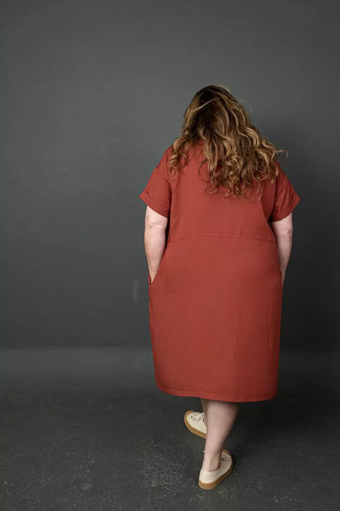 Inspired by working women, with a dash of the Twenties. The Factory Dress slips over the head, features pockets and ready-rolled up sleeves. The Factory dress is 'easy fit' so use the bust measurement only for sizing. We have included a seperate pattern to make the Factory a top.