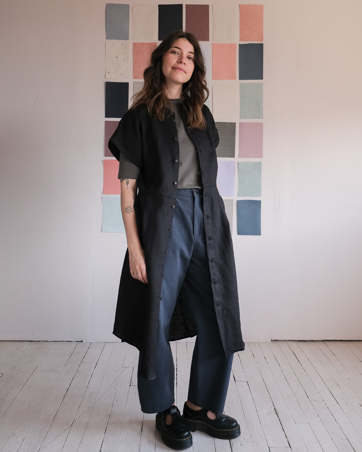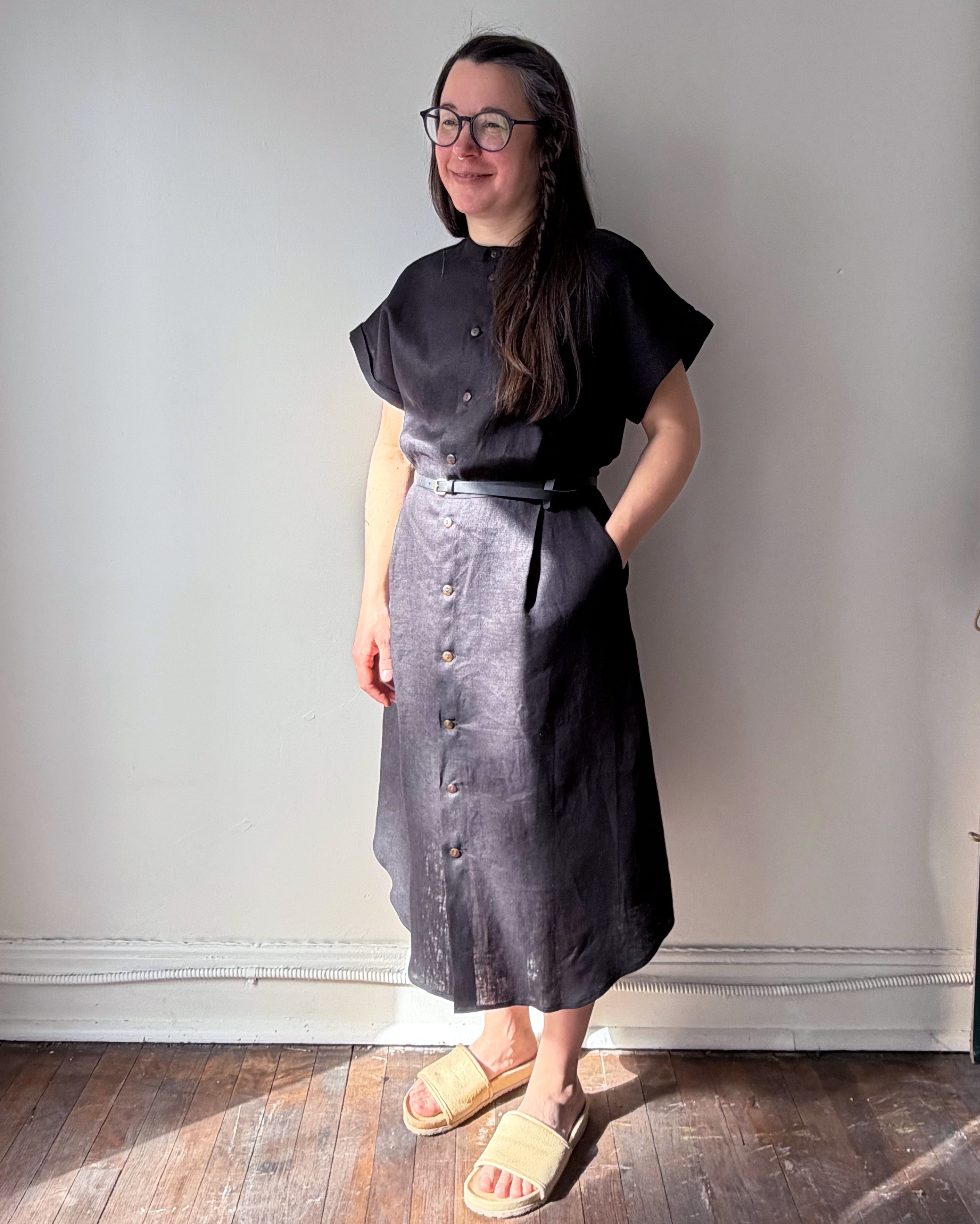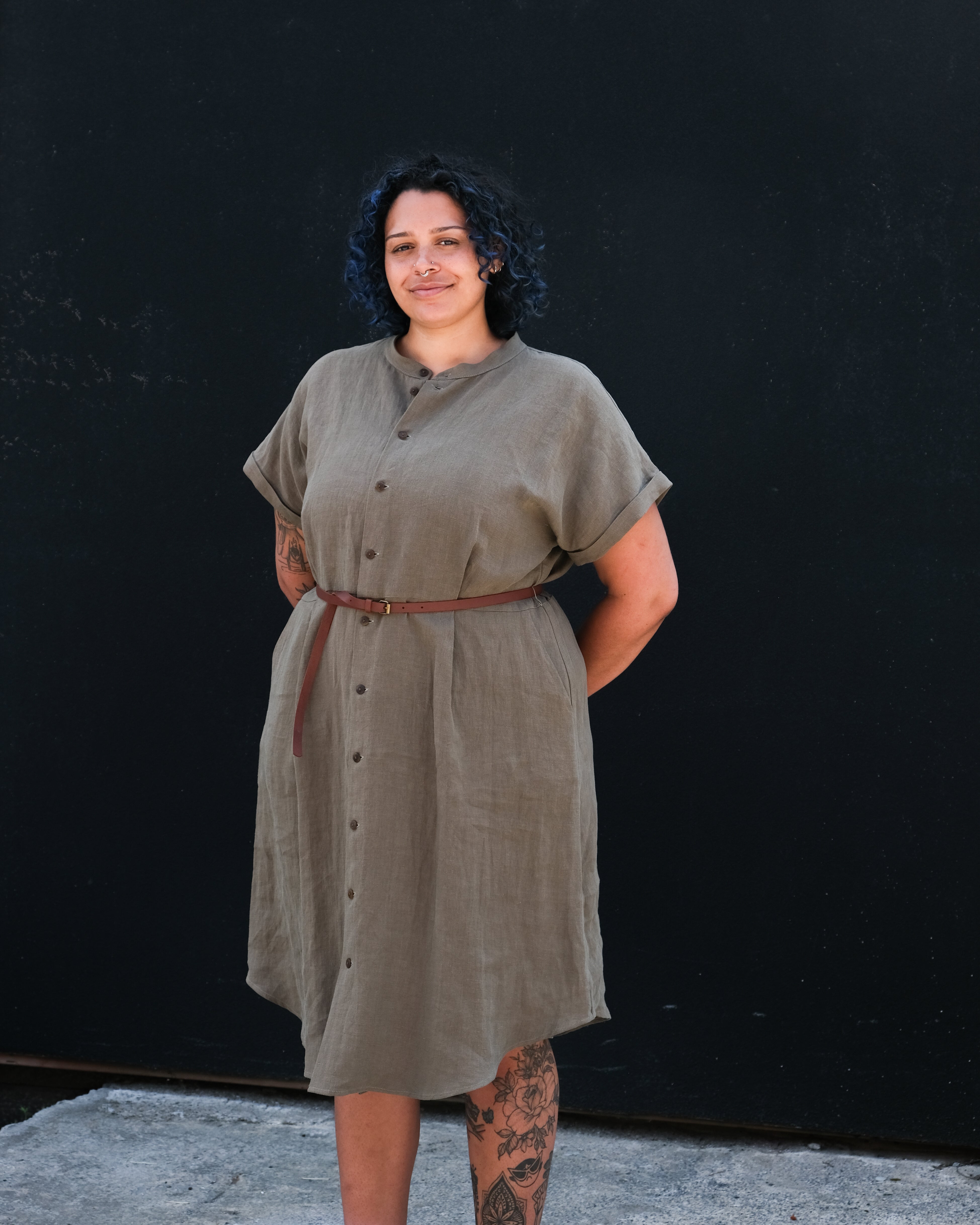 We were inspired by our No2464w dress to create a light, summery version. The cut is loose, A-line and slightly fitted at the waist. We made a selection of two linens, black linen and khaki pre-soaked linen. Short, even sleeves with lapels. Slanted front pockets. Waist pleats at front and back. Officer's collar, tortoise buttons. Rounded hem reaching below the knee.