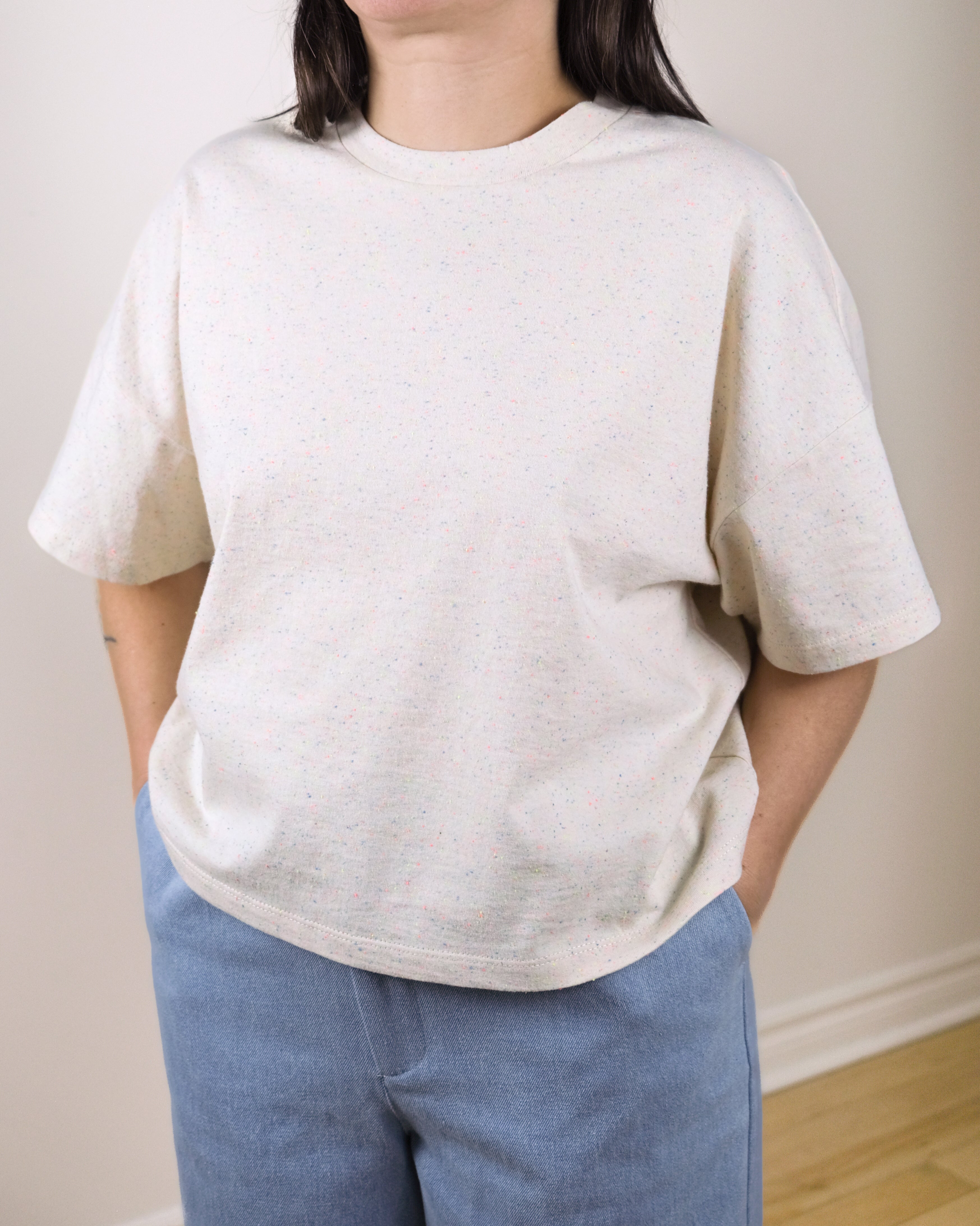 The confetti are back and our jersey is now knitted in Canada. The No2470w box tee is a loose-fitting, cropped version of our No6076u unisex tee. Made with a soft cotton jersey knit, it features a boxy fit, dropped shoulders and a round neckline. Available in two colours: cream and black.